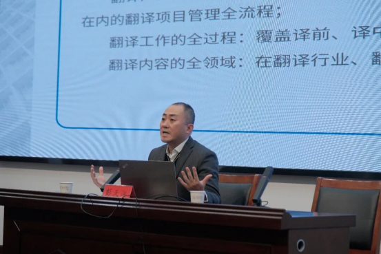 本次研讨会分学术报告和座谈研讨两个阶段。第一阶段,彭天洋教授作题为“数智时代的翻译和外语人才核心素养”的专题讲座。他深入剖析了人工智能技术对翻译行业的深远影响,指出尽管技术迭代迅猛,高素质外语人才仍是支撑国际传播与跨文化交流的中坚力量。彭教授系统阐释了行业转型中的“变”与“不变”,强调数智时代外语人才应具备四大核心素养:扎实的双语能力、丰富的跨领域实践经验、熟练的智能技术应用能力以及敏锐的跨文化交际意识。他提出,“人机协作”的本质在于拓展人才能力边界、优化工作模式,而非简单替代,呼吁外语人才主动拥抱技术变革,持续提升综合素养,更好服务国家对外开放与社会发展。